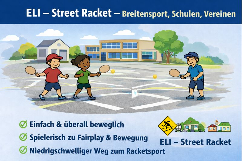 Das Ziel der Einführung von ELI – Street Racket in den Breitensport, in Schulen und in Vereinen besteht darin, einen einfachen, spielerischen und überall umsetzbaren Einstieg in Bewegung und Racketsport zu ermöglichen. Street Racket folgt dem Grundprinzip „Play anywhere – play anytime“ und setzt bewusst auf niedrige Einstiegshürden, damit Kinder, Jugendliche und Einsteiger*innen unabhängig von Leistungsstand, Infrastruktur oder sportlicher Vorerfahrung sofort aktiv werden können.